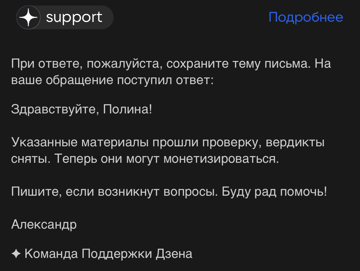 Но это мне логично, но не Дзену, который отвечает, что если правки были, то значит ограничение и отключение от монетизации было правомерным и никаких данных о времени или содержании правок и времени вынесения предупреждений мы вам не предоставим.