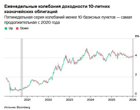последние два десятилетия. С 2006 года средний недельный диапазон доходности 10-летних облигаций составлял 16 базисных пунктов. За последние пять недель он был меньше 10 базисных пунктов, что является самым продолжительным сопоставимым периодом с 2020 года. Эта тенденция, обусловленная в первую очередь ожидаемой стабильностью денежно-кредитной политики США, вызывает беспокойство у специалистов по рынку облигаций, поскольку в предыдущих случаях сужения диапазона доходности за этим следовали распродажи. Доходность 10-летних облигаций в диапазоне от 4,1% до 4,2% с середины декабря выдержала потрясения, в том числе данные по занятости за декабрь, действия Министерства юстиции США против председателя ФРС Джерома Пауэлла и перспективу военных действий США в Иране, отметил в своём отчёте Иэн Лигнен, стратег по процентным ставкам в BMO Capital Markets. «Инвесторам остаётся только гадать, что потребуется для того, чтобы доходность 10-летних облигаций достигла 4,25 % или 4,05 %», и «мы напом