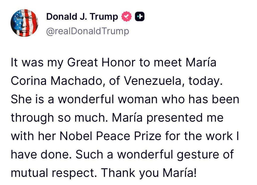 Дональд Трамп стал обладателем Нобелевской медали мира, однако получил её не от профильного комитета в Осло, а в качестве подарка. Лидер венесуэльской оппозиции Мария Корина Мачадо передала президенту США свою личную награду в ходе официальной встречи. По её словам, этот поступок символизирует признание вклада Трампа в поддержку демократических процессов. Сам Дональд Трамп выразил признательность в социальных сетях, назвав поступок Мачадо «замечательным жестом взаимного уважения». Президент отметил стойкость венесуэльской активистки и подчеркнул, что для него большая честь принять столь значимую награду из её рук. Ранее мы писали, что лидер венесуэльской оппозиции готова наградить Трампа Нобелевкой.