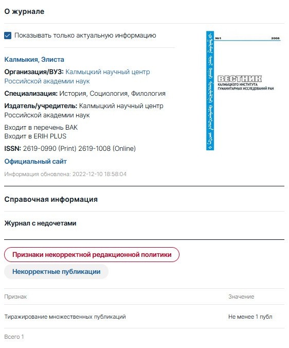 ) Калмыкия, Элиста Специализация: История, Социология, Филология Издатель/учредитель: Калмыцкий НЦ РАН Входит в перечень ВАК, ERIH PLUS https://www.dissernet.org/magazine/oriental_studies_vestnik_kalmytskogo_instituta_gumanitarnykh_issledovaniy_ran