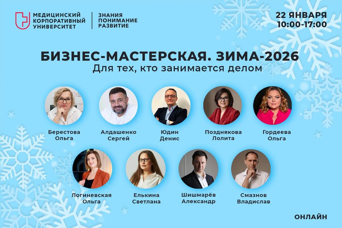 Год начитается интересно!💫 Мы собираемся на конференцию и вас приглашаем! «Бизнес-мастерская. Зима 2026» — это один день плотной практики, управленческих инсайтов и прикладных инструментов от ведущих экспертов МКУ и рынка медицинского бизнеса. 22 января 2026 г. 10:00 – 17:00 (МСК) онлайн В фокусе программы — практика для роста вашей клиники: 🔴 24P медицинского маркетинга – Ольга Берестова 🔴 Опыт построения единого цифрового контура в ГК «Клиника Семейная» – Сергей Алдашенко 🟡 OKR как новый способ самомотивации сотрудников – Денис Юдин 🟡 Особенности законодательства в рекламе медицины – Лолита Позднякова 🟡 Как проводить CustDev в медицинском бизнесе – Ольга Гордеева 🟡 Аудиофиксация врачебных приёмов и сопоставление с Калгари-Кембриджской моделью – Светлана Елькина 🟡 CRM-система в медицине как стратегический инструмент управления бизнесом – Александр Шишмарёв Вы получите за один день: ✔️ Прикладные решения и работающие методики ✔️ Реальные кейсы от ведущих медицинских клиник