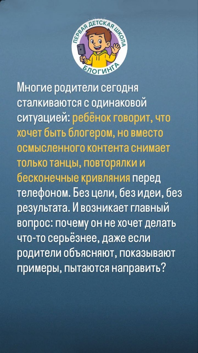 Многие родители сегодня сталкиваются с одинаковой ситуацией: ребёнок говорит, что хочет быть блогером, но вместо осмысленного контента снимает только танцы, повторялки и бесконечные кривляния перед телефоном. Без цели, без идеи, без результата. И возникает главный вопрос: почему он не хочет делать что-то серьёзнее, даже если родители объясняют, показывают примеры, пытаются направить? Причина гораздо глубже, чем кажется, и она всегда начинается с работы мозга. Детский мозг выбирает самое лёгкое — быстрое действие, которое приносит хоть какую-то награду. Танцы и кривляния — это минимальная нагрузка: не надо думать, придумывать, составлять текст, работать с подачей. Не нужно переснимать, анализировать и бояться ошибки. Включил камеру — повторил то, что видел у Тани, Оли, Маши. Это не блогинг. Это имитация блогинга. Но для ребёнка — это удобно. И здесь вступает в игру ещё один огромный фактор, о котором говорят редко, но который полностью определяет, что ребёнок снимает дальше: алгоритмы