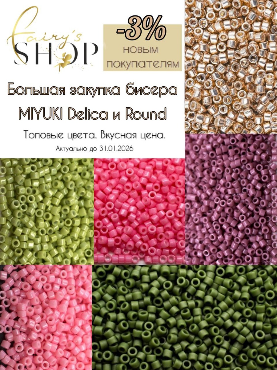 Невероятное количество цветов и очень выгодная цена!💫 Волшебницы, напоминаем, что на канале Совместной Закупки стартовала БОЛЬШАЯ ЗАКУПКА Японского бисера MIYUKI 🔥Новым покупателям дарим СКИДКУ -3% (скидка действует только на заявленную закупку БИСЕРА MIYUKI)🔥 К заказу доступны: - MIYUKI DELICA 11/0 - MIYUKI ROUND 8/0 - MIYUKI ROUND 11/0 - MIYUKI ROUND 15/0 💐Невероятное разнообразие цветов, включая самые востребованные! ⚡По возможности дозаказываем цвета по вашим заявкам! 📍Сроки бронирования - до 31.01.2026 г. 🚛Ориентировочный срок отправки покупателям - март 2026г. 👉🏻Вступить в группу Совместной Закупки FAIRY’S SHOP можно по ссылке: https://t.me/+-iGAYr0rUrQxOWY6 🛍Закупка бисера начинается здесь : https://t.me/c/1719736837/89905 Пишите под постом с выбранным товаром количество упаковок. Присоединяйтесь к волшебному комьюнити FAIRY’S SHOP, с нами магия творчества становится доступнее и увлекательнее! 💝