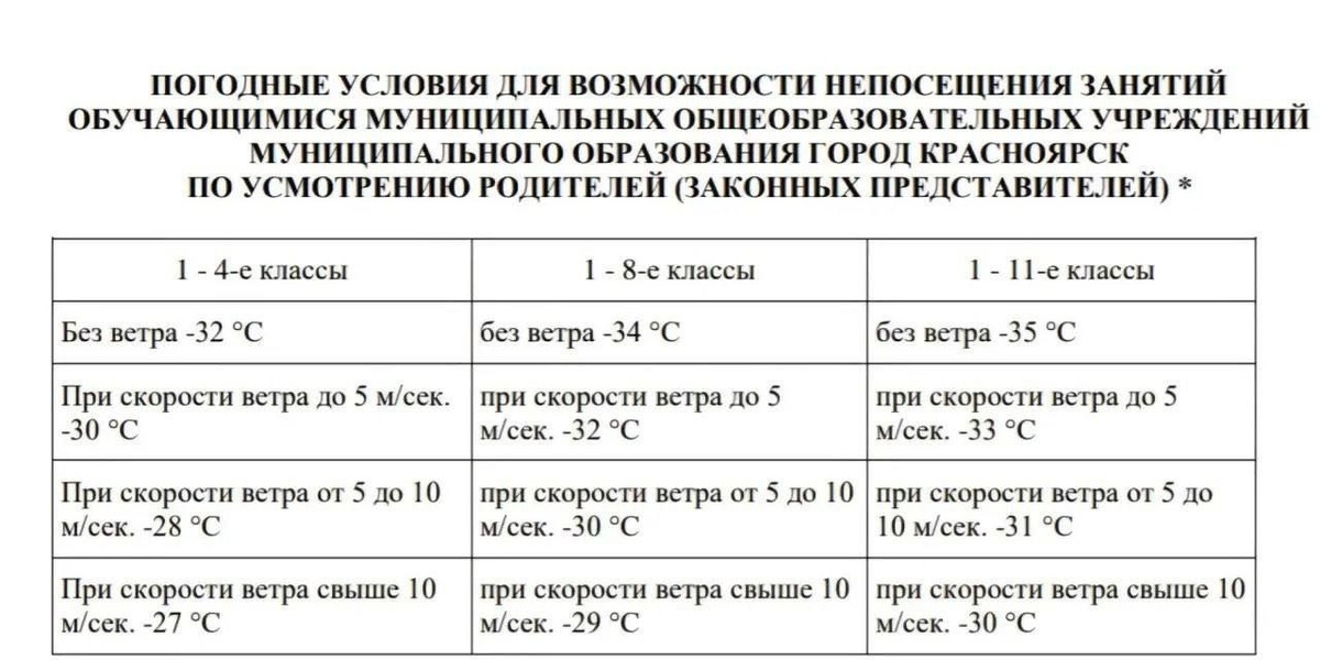🌨️⛅ В Красноярском крае установились сильные зимние холода, характерные для Сибири. Несмотря на суровые условия, все образовательные учреждения региона работают в обычном режиме. ❗ Однако родители имеют право самостоятельно решать, отправлять ребёнка на занятия или оставить дома в зависимости от температуры воздуха и погодных условий. ▌ Как определить погоду? ✔️ Проверяйте температуру утром: - Для учащихся первой смены — ориентируйтесь на данные на 06:00 утра. - Для школьников второй смены — смотрите показатели на 11:30 утра. Официальные сведения публикуются на сайтах Главного управления образования, Единой диспетчерской службы и мобильного приложения службы спасения 112 Красноярского края. 👉 Если оставить ребёнка дома невозможно, школа готова встретить всех детей в положенное время. Будьте внимательны и заботьтесь о здоровье ваших близких!
