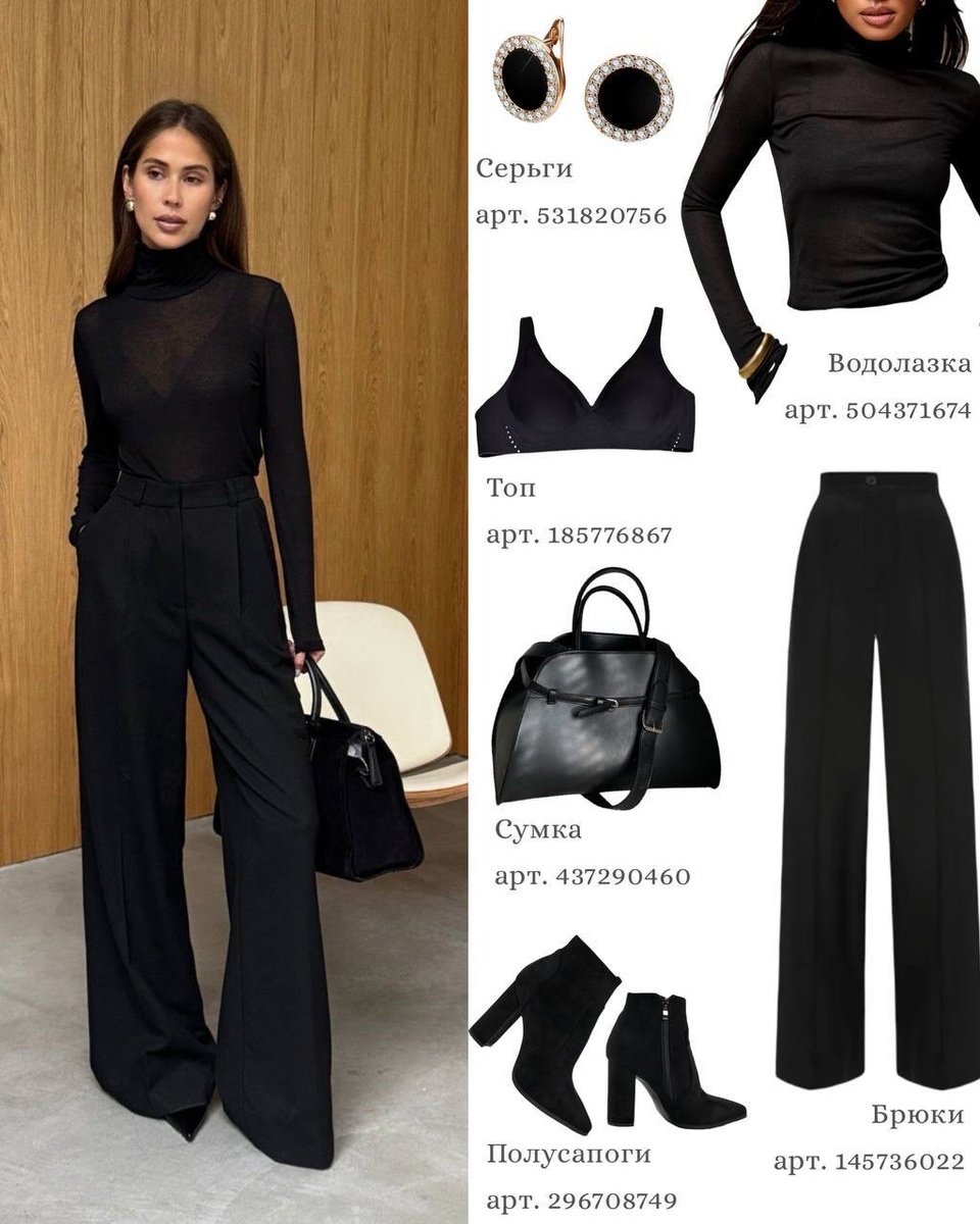 Водолазка, широкие брюки и лаконичная сумка создают образ, который говорит сам за себя. Чёрный цвет подчёркивает строгость, вытягивает силуэт и всегда выглядит дорого.