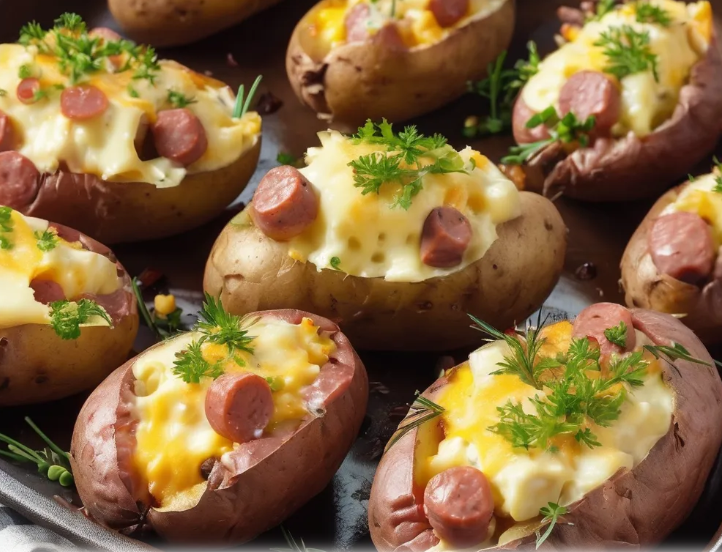 Смешивание ингредиентов:В Подготовленный картофель выложить нарезанные сосиски и лук. Добавьте оливковое масло, соль, перец и по желанию специи. Выпекание:Выложите картофель на противень, застеленный пергаментной бумагой или смазанный растительным маслом. Запекайте в разогретой духовке в течение 30-40 минут или до тех пор, пока картофель не станет мягким и золотистым.