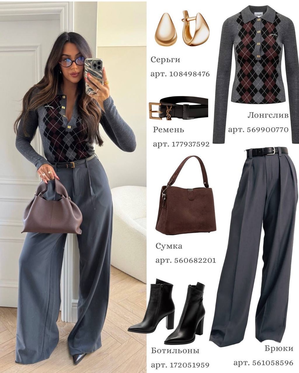 Образ в серо-графитовой гамме — идеальный вариант для офиса и повседневных дел. Широкие брюки с высокой посадкой формируют вытянутый силуэт, а лонгслив или тонкий джемпер добавляет лёгкости и баланса. Обувь на каблуке делает образ более собранным, а сумка в тон завершает композицию.