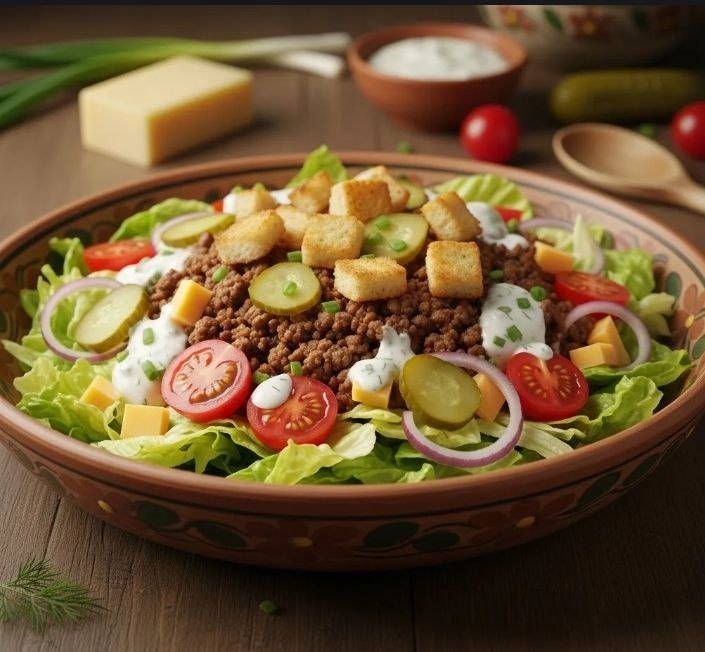 »🍔 ⏱15 минут | 185 ккал(100 г) 🛒Что нужно: 🥩Фарш говяжий (обжаренный) или ветчина — 200 г 🧀Сыр чеддер или твердый — 80 г 🥗Листья салата (айсберг) — 100 г 🍅Помидоры черри — 100 г 🥒Огурцы маринованные — 2 шт. 🧅Красный лук — 1/2 шт. 🥣Греческий йогурт + капля горчицы и кетчупа — 2 ст.л. 🌾Сухарики (вместо булки) — горсть 👩🍳Как готовить: Обжарьте фарш до готовности (или нарежьте ветчину соломкой). Салат порвите руками, помидоры и огурцы нарежьте дольками, лук — тонкими полукольцами. Сыр натрите или нарежьте мелкими кубиками. Смешайте все ингредиенты, заправьте соусом и посыпьте сухариками перед самой подачей, чтобы они приятно хрустели.