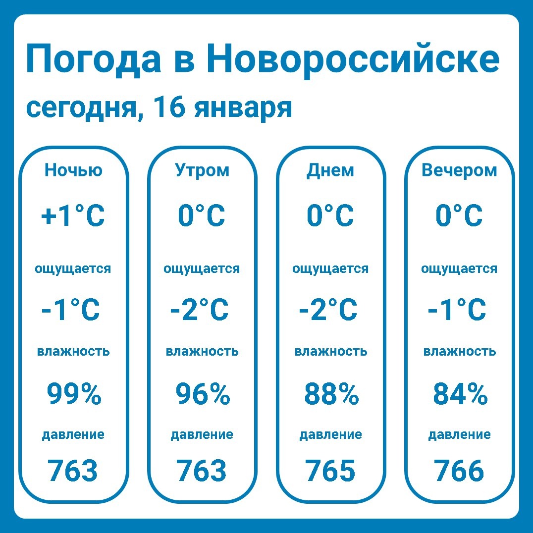 Погода в Новороссийске сегодня 16 января +1°C..0°C, облачно с прояснениями, снег Ночью пасмурно, дождь, температура: +1°C, ощущается как: -1°C, вероятность осадков: 100%, ветер, южный: 5 м/с, влажность: 99%, давление: 763 мм рт. ст. Утром пасмурно, сильные осадки, температура: 0°C, ощущается как: -2°C, вероятность осадков: 100%, ветер, северный: 4 м/с, влажность: 96%, давление: 763 мм рт. ст. Днем облачно с прояснениями, снег, температура: 0°C, ощущается как: -2°C, вероятность осадков: 50%, ветер, северо-западный: 5 м/с, влажность: 88%, давление: 765 мм рт. ст. Вечером пасмурно, небольшой снег, температура: 0°C, ощущается как: -1°C, вероятность осадков: 30%, ветер, северо-западный: 3 м/с, влажность: 84%, давление: 766 мм рт. ст. Восход: 08:01 Закат: 17:15 Световой день: 09:13:19 Фаза луны: последняя четверть ㅤ