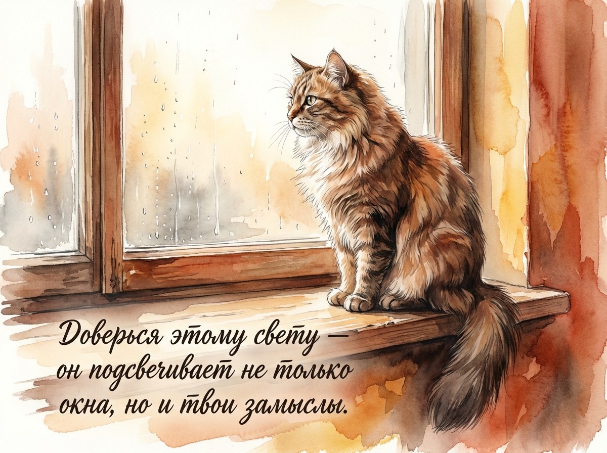 Ты уже достаточно просто тем, что проснулся сегодня; твой путь не измеряется скоростью, а глубиной дыхания и мягкостью шага. Доверься этому свету — он подсвечивает не только окна, но и твои замыслы. Посмотри, как спокойно я сижу у окна и внимательно вслушиваюсь в мир. Возьми у меня это умение: двигаться неторопливо, но убедительно, беречь свои силы и своё сердце. Сегодня каждый твой небольшой шаг — важный штрих в большой картине жизни, и я рядом мысленно мурлычу, напоминая: ты имеешь право на новые начала, на выбор в свою пользу и на день, который будет добрее, чем вчера.