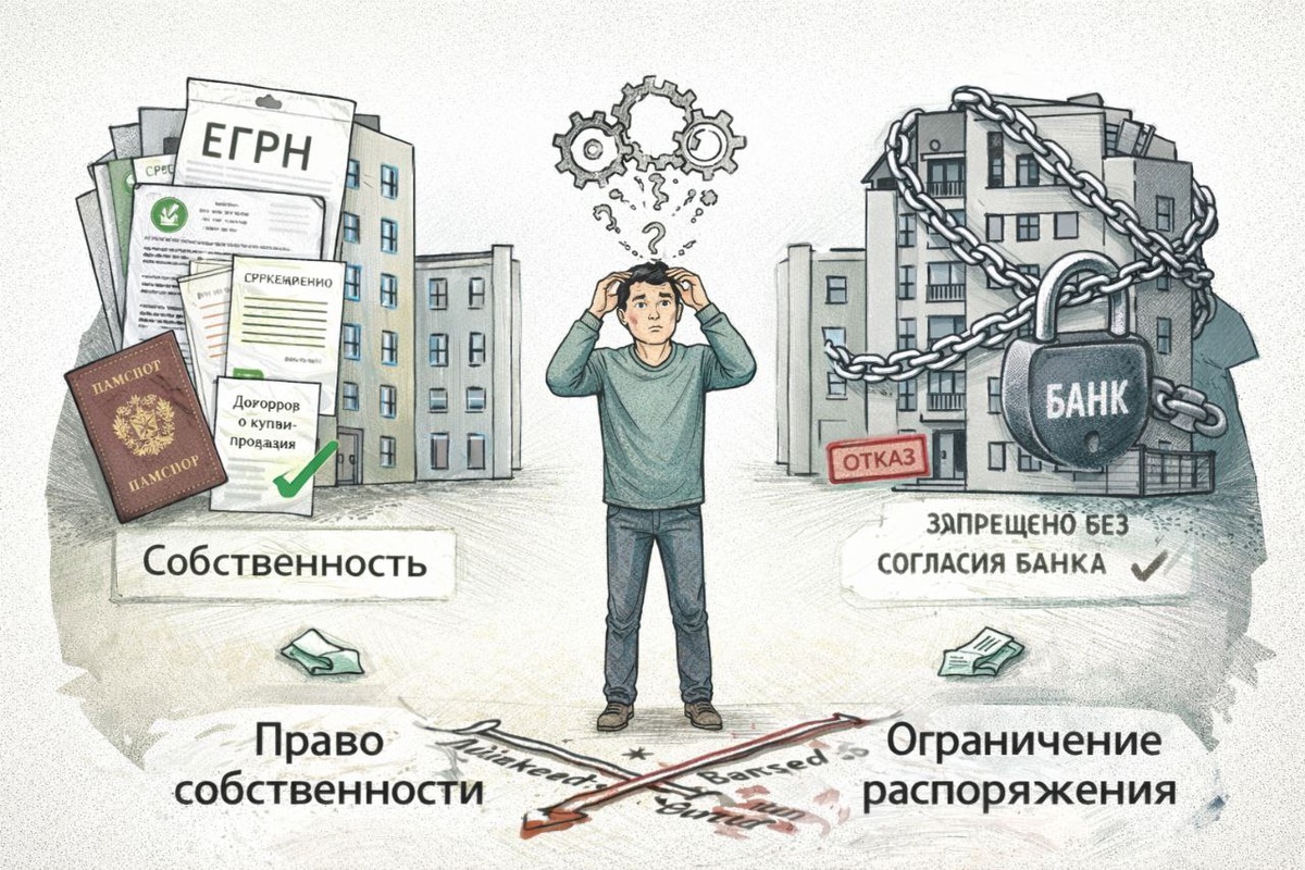 Вопрос: это чья квартира? 56% отвечают: банка. 44% — моя. Давайте разберёмся. Кто указан собственником в ЕГРН — банк? Почему тогда выписка из ЕГРН приходит вам на Госуслуги? И почему договор купли-продажи подписывали именно вы как покупатель? Если банк собственник, получается, вы взяли у него деньги и теперь платите банку за аренду квартиры. Но ведь это не так Тогда откуда возникает сомнение, что вы — собственник? Вот здесь обычно и ломается логика. Теперь — занудно, но важно. Собственником является тот, кто записан в ЕГРН в графе «Правообладатель» и это вы. При ипотеке право собственности принадлежит покупателю, а в договоре купли-продажи, вы указаны как покупатель - идите и посмотрите свой договор. А у банка — обременение в виде залога. Если проще: банк дал вам деньги и, чтобы вы их точно вернули, а не сбежали, установил ограничение на распоряжение квартирой в Росреестре. Продать, подарить, обменять — только с согласия банка. Вот и всё. Ипотека — это не собственность банк