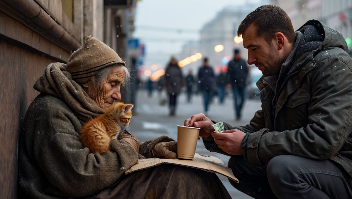 Старушка не просила вслух. Она просто сидела, прижимая к себе котенка, и смотрела в пустоту усталыми глазами. Иногда котенок жалобно мяукал, и тогда женщина гладила его дрожащей рукой.