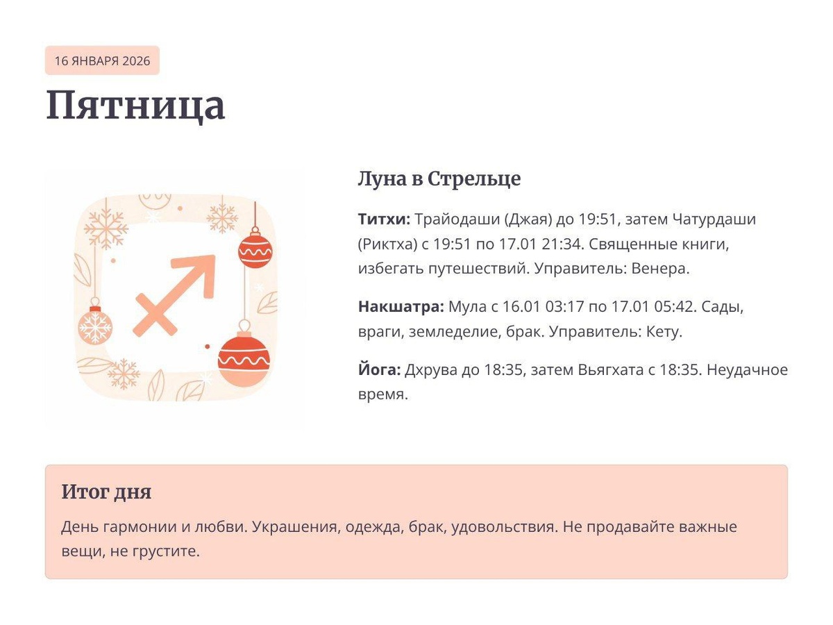 ГОТОВЫ ВЫЖЕЧЬ СВОЁ ПРОШЛОЕ? Стойте. Прежде чем планировать на день вперёд - закройте глаза. Представьте, что прямо сейчас Вселенная вручает вам хирургический скальпель и говорит: «Режь всё, что больше не служит твоей душе». Страшно? Ещё бы. Но сегодня - идеальный день для этого. Если вы давно чувствовали груз незавершённых дел, старых обид или отношений, которые тянут назад - сегодня ваша точка невозврата. Не упустите её. 🌌ЧТО ПРОИСХОДИТ НА НЕБЕ: ОГОНЬ ПОДО ЛЬДОМ Венера в Козероге «сожжена» Солнцем. Знаете это чувство, когда хочется любви, красоты, денег - а внутри только холодный расчёт и трезвость? Это оно. Никаких розовых очков. Только факты. А ночью в Козерог ворвался Марс - планета ярости и действия. Напряжение будет нарастать, как пар в котле. Будьте осторожны: сегодня сила легко превращается в грубость. Луна в Стрельце, в накшатре Мула - «Корень». Мула - это не просто звезда. Это правда без прикрас. Она не для того, чтобы строить, а чтобы вырывать с корнем всё, что отжило: