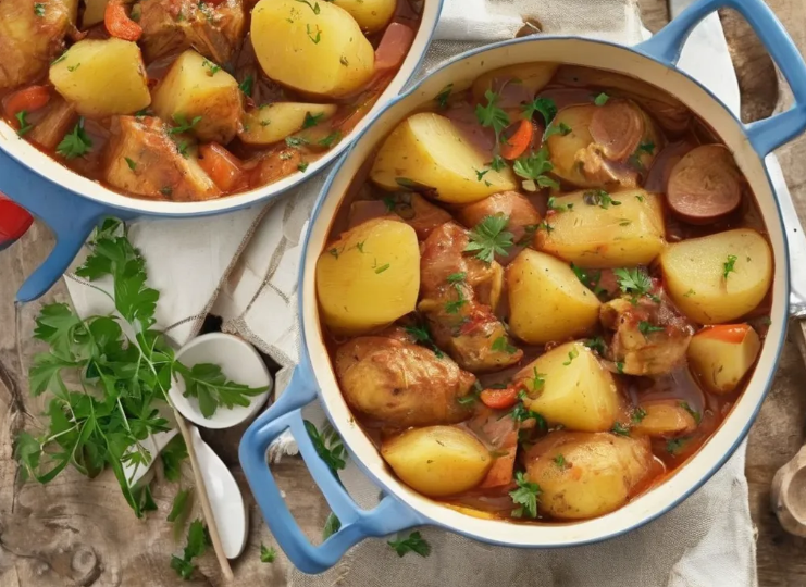 Закройте крышку и тушите на среднем огне около 30-40 минут, пока картофель и курица не станут мягкими. - Подача:Подавайте горячим, при желании посыпав свежей зеленью.