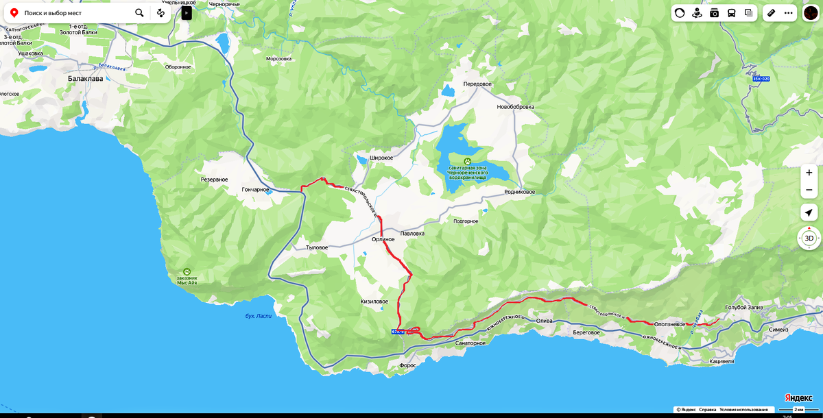 Начало месяца, а именно новогодние каникулы получились очень дождливыми и серыми. Но ведь погода не должна влиять на наши прогулки! Тем более, что ко мне в Севастополь уже приехал и Миша! Значит покатаемся, а потом погода подскажет, где погулять. Так как с нами был Антон и он только слышал о Старой Севастопольской дороге, мы решили по ней проехать. Только в этот раз ехали как положено, через Орлиное по Байдарской долине, через Форосскую церковь на скале и дальше, где мы уже были ( показывала здесь -Красота Старой Севастопольской дороги.) - показано красным цветом на карте. Фоток мало, из-за льющегося на нас дождя. Байдарские ворота представляют собой просто сооружение на дороге. Скорее всего, это был пропускной пункт. На Форосской церкви невозможно было обойти и сделать фото. Ветер с моря просто хлыстал дождем. Было 7 января, машин, стоящих на обочине этой крутой и узкой дороги было очень много. А дальше пошли уже места знакомые для нас с Мишей. Антон здесь был впервые. Мы решили прок