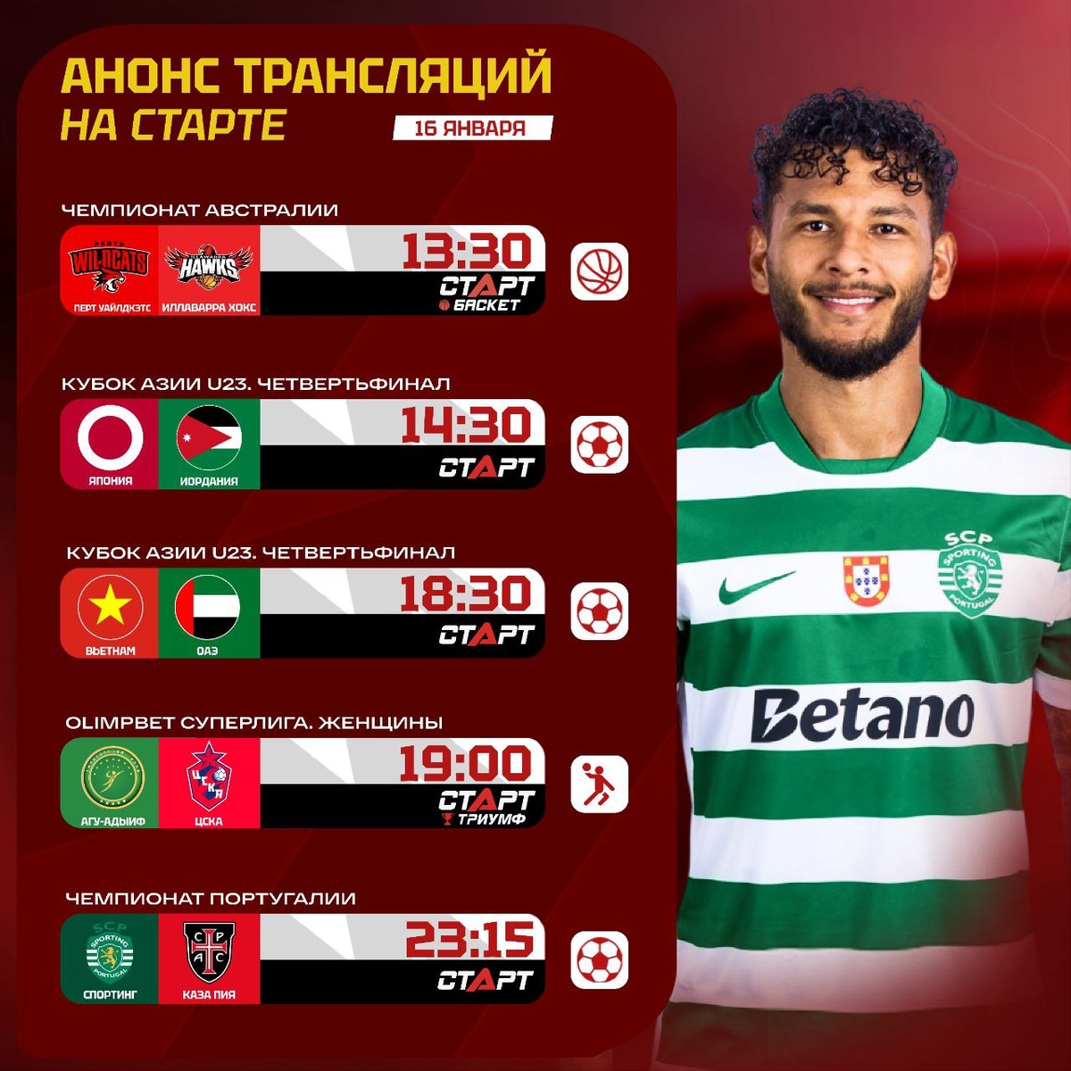 ! Начинаем ее с австралийского баскетбола. «Перт Вайлдкэтс» на серии из трех побед принимает «Иллаварру Хоукс» Джавейла Макги. Далее узнаем двух полуфиналистов молодежного футбольного Кубка Азии. Вечером насладимся красотой женского гандбола – ЦСКА отправится на выезд в Майкоп. Ну и завершаем день в Лиссабоне, «Спортинг» ждет третья попытка одержать первую победу в 2026-м году. Оставайтесь весь день на телеканалах «Старт» и платформе TVSTART.RU 🖥 Подписывайся на ТВ СТАРТ в MAX📲