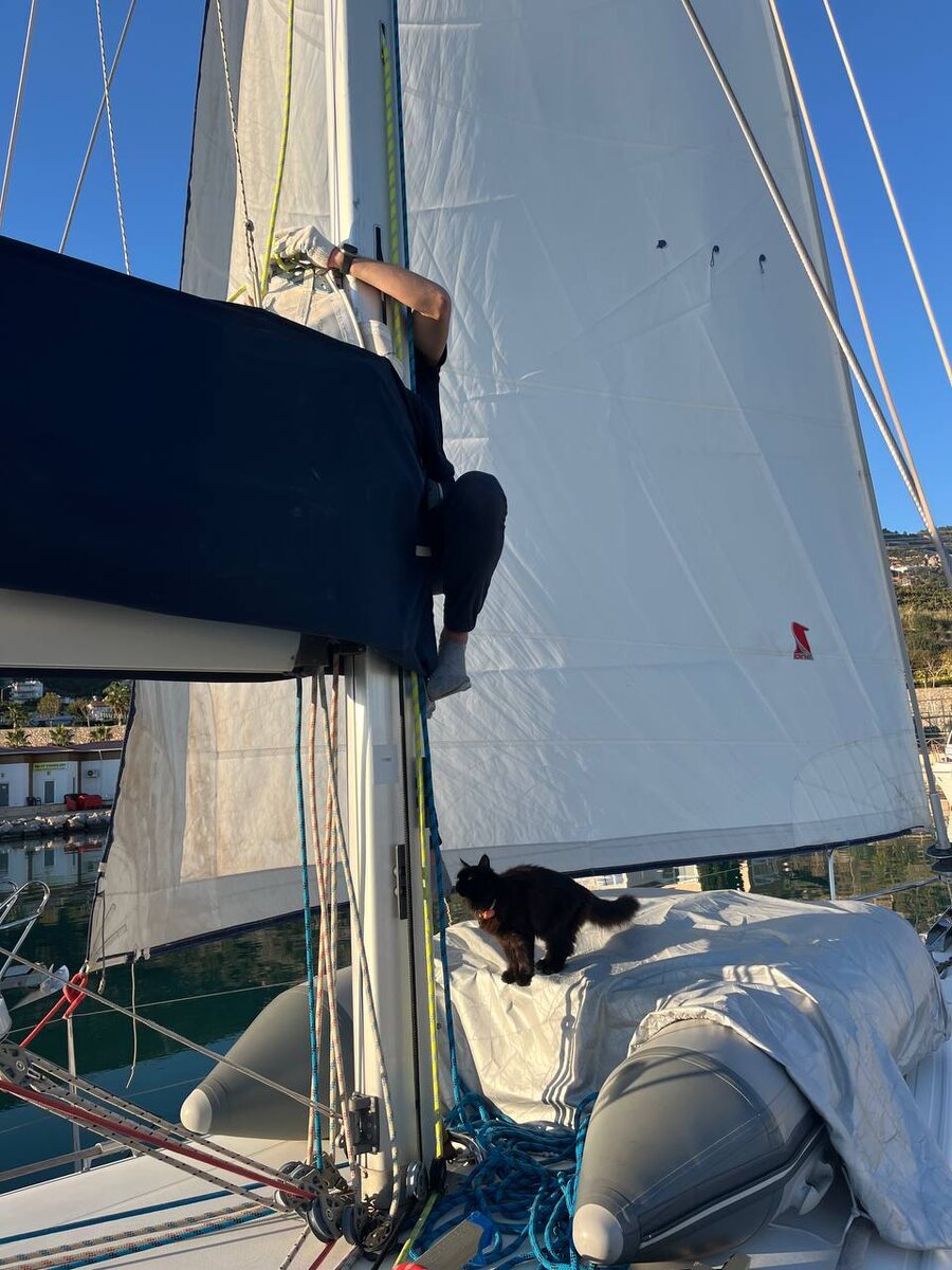 ! В общем, в мае мы сняли геную, чтобы подняться. Сказали нам об этом за 10 минут до подъема, так что снимали быстро и без раздумий. (Стоять со стакселем на ботярде запрещено) Мы уже на воде, но стаксель возвращать обратно не торопились - повезем его на стирку и ремонт. Вчера было принято решение, что ему надо таки подышать и расправиться, поэтому вешаем. Стаксель вытащили из каюты, притащили на нос и тут выяснилось, что мы понятия не имеем как он крепился. Но вроде вот дырка и вот дырка - как будто бы под скобы, давай попробуем. Стаксель у нас на закрутке, так что мне пришло в голову гениальное решение - закрутку надо раскрутить, чтобы потом закрутить! Закрепили фаловый угол, нашли ликпаз, поднимаем - фал подсох, идет тяжело, но мы справились - подняли, закрепили галсовый и шкотовый углы. Сушится. В этот момент приходит сообщение, что нам дали ВНЖ, я приготовилась делать праздничный медовик, а ещё закат бы встретить - надо убирать стаксель и выходить! И тут мы понимаем, ч