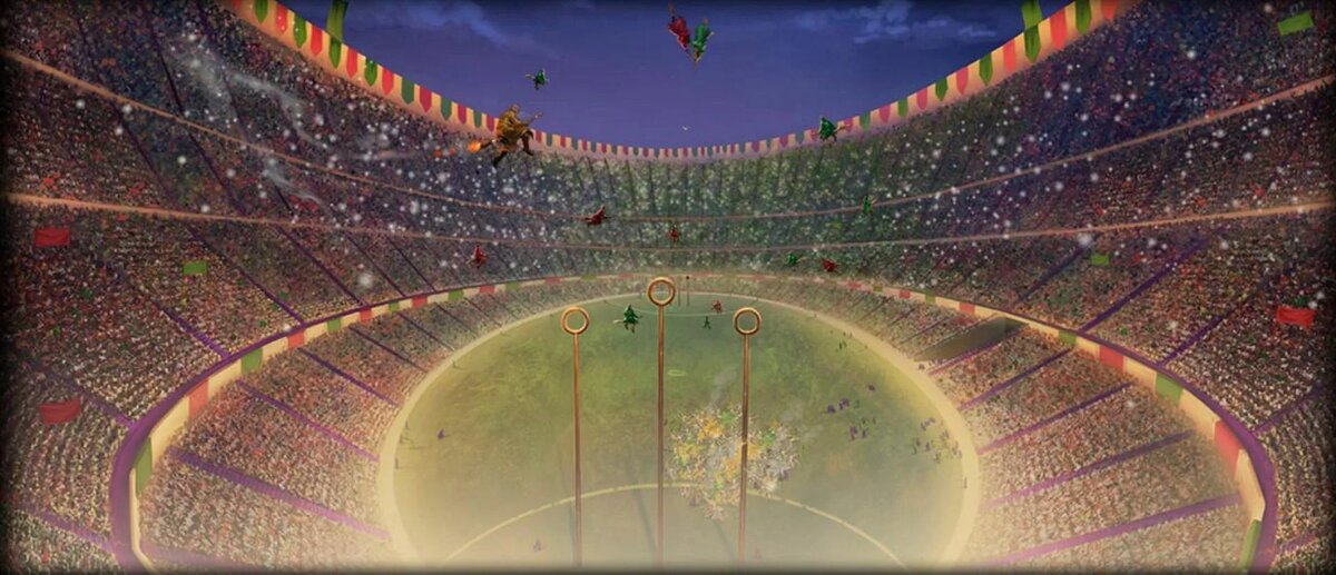 Альбус Поттер чуть не вывалился из VIP-ложи, приветствуя своего героя. Его дядя Рональд схватил его за мантию и спас от смерти, которая наверняка стала бы событием международного масштаба и породила бы сенсационные новости по всему волшебному миру. Брат Джеймс от души смеется (он что, толкнул брата?). Гарри Поттер, кажется, совершенно не обеспокоен, просто вручает своему второму сыну одно из угощений "Полоумной" Лавгуд.