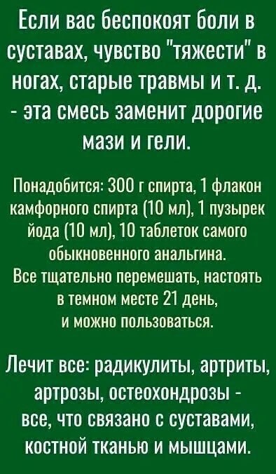 Почему это опасно: 🔥Химический ожог: Смесь спирта, камфоры и йода крайне агрессивна. Регулярное втирание приведет к иссушению кожи, дерматиту и серьезным ожогам. 🍄Токсичность йода: Через поры кожи йод активно всасывается в кровь. Избыток йода может «отключить» вашу щитовидную железу или вызвать йодизм (отравление). 👎Иллюзия лечения: Анальгин в составе лишь временно притупляет боль, но никак не лечит причину — артрит или артроз. Пока вы мажете ногу «настойкой», болезнь прогрессирует, разрушая сустав. Вердикт: Это средство не заменяет современную терапию. Оно не восстанавливает хрящ и не лечит радикулит, а лишь создает разогревающий эффект, маскируя симптомы. #здоровье #вредныесоветы