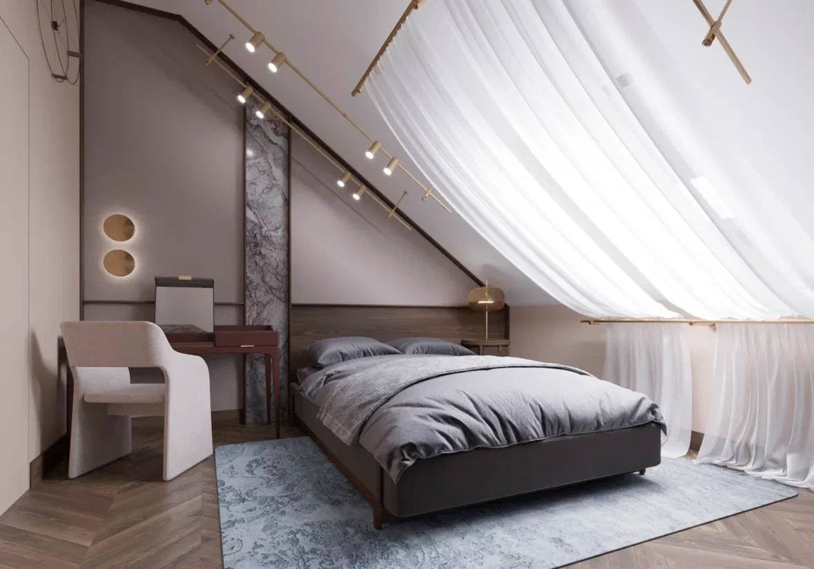 Эту мансардную спальню мы разработали для иркутского застройщика «Хрустальный», чтобы наглядно показать потенциальным покупателям, что вообще делать с таким окном.