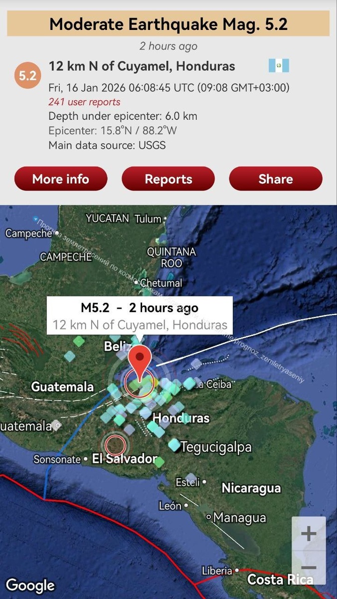 Пока что ощутимым умеренным землетрясением отработал Гондурас (см. фото 3-5 в предупреждении от 13 января)