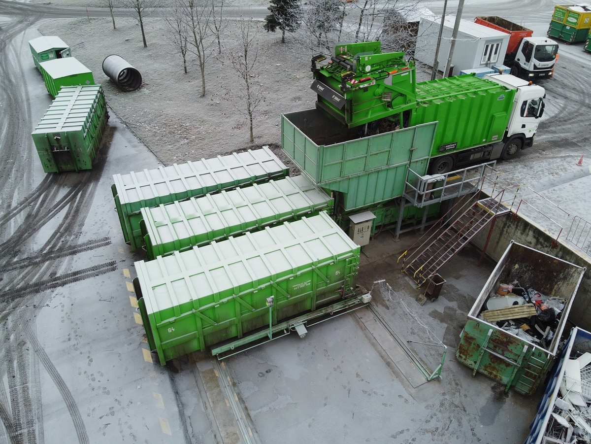 - Перегрузка на МПС. На территории МПС мусоровоз выгружает содержимое в специализированные крупногабаритные контейнеры объемом от 27 до 30 м³ (в некоторых проектах до 36 м³). Перед загрузкой отходы подвергаются обязательному уплотнению (прессованию) с помощью пресс-компакторов. Благодаря этому объем мусора сокращается на 2535%, что значительно повышает эффективность последующей транспортировки.