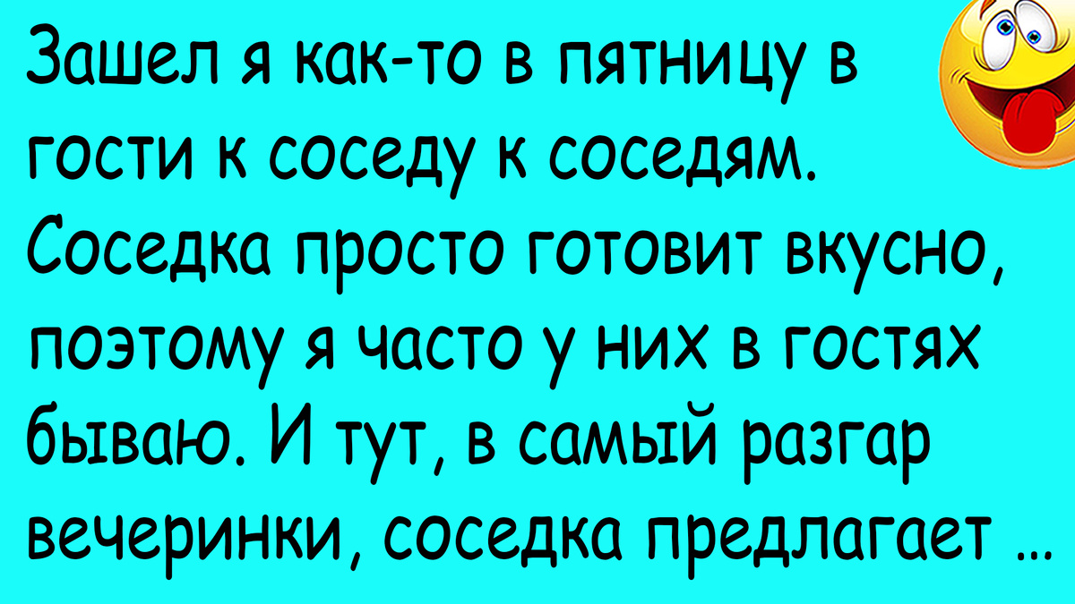 С соседями я нахожусь в хороших отношениях. Мы с ними и праздники вместе справляем, и просто на выходные может друг к другу в гости заглянуть. Точнее, заглядываю обычно я к ним. А чего ко мне заглядывать? Я один живу, без жены. А у соседа жена есть – она чего-нибудь, но обязательно приготовит. Я имею ввиду, из еды. Так вот, в конце недели забрел по привычке к соседям, чтобы пятницу отметить. Если кто не знает, то это такой великий праздник, который ознаменовывает окончание тяжёлой рабочей недели и начало легких выходных, которые помогают нам подготовиться к самому тяжелому дню следующей недели – понедельнику. Как по мне, так этот праздник гораздо важнее Нового года. Ведь на Новый год мы долго отдыхаем и долго к нему готовимся. А тут неожиданно, Бац – и пятница! Естественно, в этот день люди строят планы на выходные – как их провести так, чтобы потом не обидно было на работу идти. Ну и соседка предлагает своему мужу: - Валера, я предлагаю нам с тобой в субботу в гости сходить. Сосед, уд