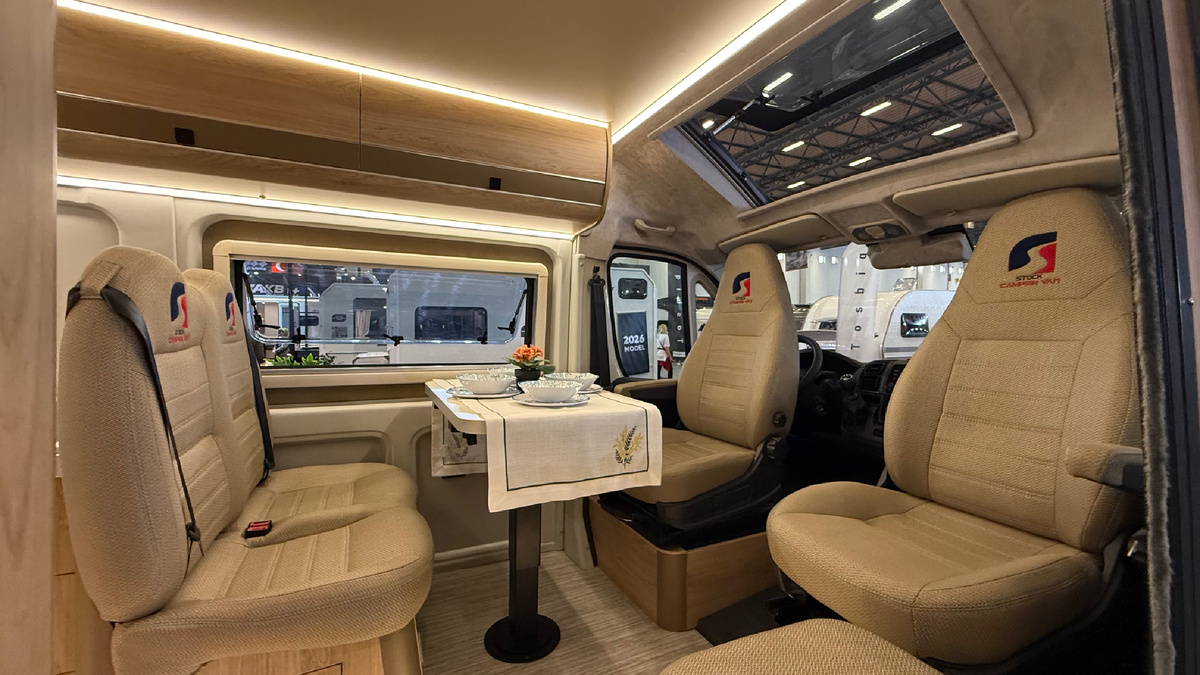 Продолжаем изучать дома на колесах на выставке в Стамбуле. Компания StockCamper представила интересный автодом в цельнометаллическом фургоне. Из-за сложностей импорта техники из Турции лучше переоборудовать фургон уже на российских номерах. Давайте посмотрим как это может выглядеть. В данном случае взят Fiat Ducato L3 H2 Гостиная этого кастенвагена хороша своим простором. Даже по фото видно, что люди будут сидеть с комфортом, а не «дышать друг-другу в лицо» как часто бывает в этом классе автодомов. Длина 640 позволяет чувствовать себя комфортно. За вторым рядом кресел идёт просторная кухня. И это не маленькая тумба с ящиками, мойкой и плитой, здесь есть где развернуться. Напротив большой холодильник, как принято в больших автодомах. На этом фото уже видно, что нас ждёт в задней части планировки. Вполне нормальная по размерам французская кровать и сан.узел делят эту зону. Производитель здесь применил хитрость, расширив верхнюю часть жилого модуля вставками. На мой субъективный взгляд, т