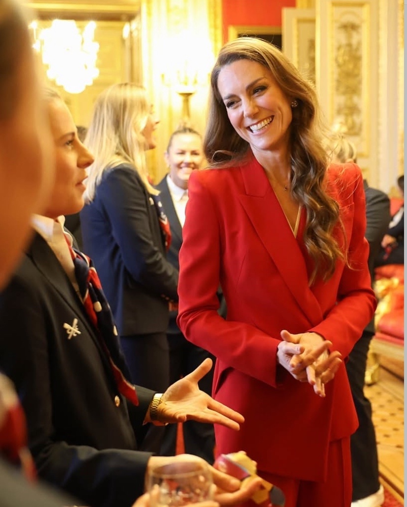 Прием в честь английской сборной по регби, устроенный принцессой Уэльской в Виндзорском замке, прошел в веселой обстановке. Мероприятие состоялось по случаю победы "Красных роз" над сборной Канады на кубке мира. Кейт, как покровительница Союза регби, была в своей стихии, обмениваясь шутками с членами команды.