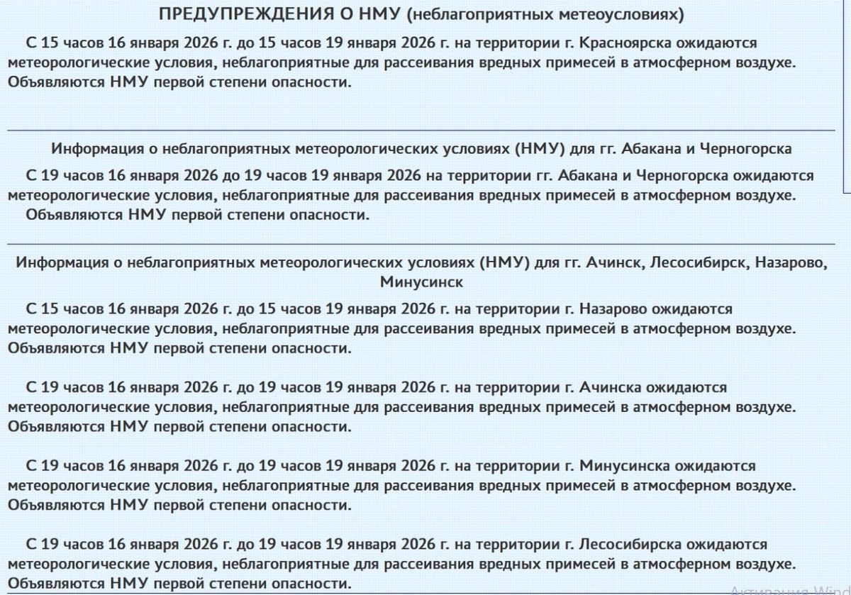 Среднесибирское УГМС объявило, что в пяти городах края объявлен режим НМУ