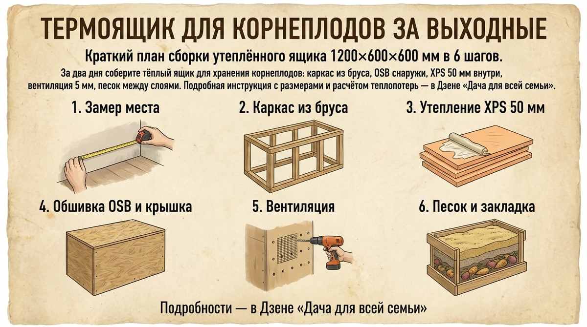 Для хранения корнеплодов на балконе или в кладовке лучше всего работает термоящик: каркас из бруса, обшивка OSB и утеплитель XPS 50 мм, крышка на петлях и 6-8 вентиляционных отверстий по 5 мм. Оптимальные габариты под стандартное место — 1200×600×600 мм: вмещает 100-150 кг картофеля и моркови, делается за выходные из доступных материалов, бюджет 4-5 тысяч. Схема ящика простая: сначала собираем жёсткий прямоугольный каркас, затем закладываем утеплитель, закрываем листами OSB, ставим крышку и делаем вентиляцию, на дно — слой песка.