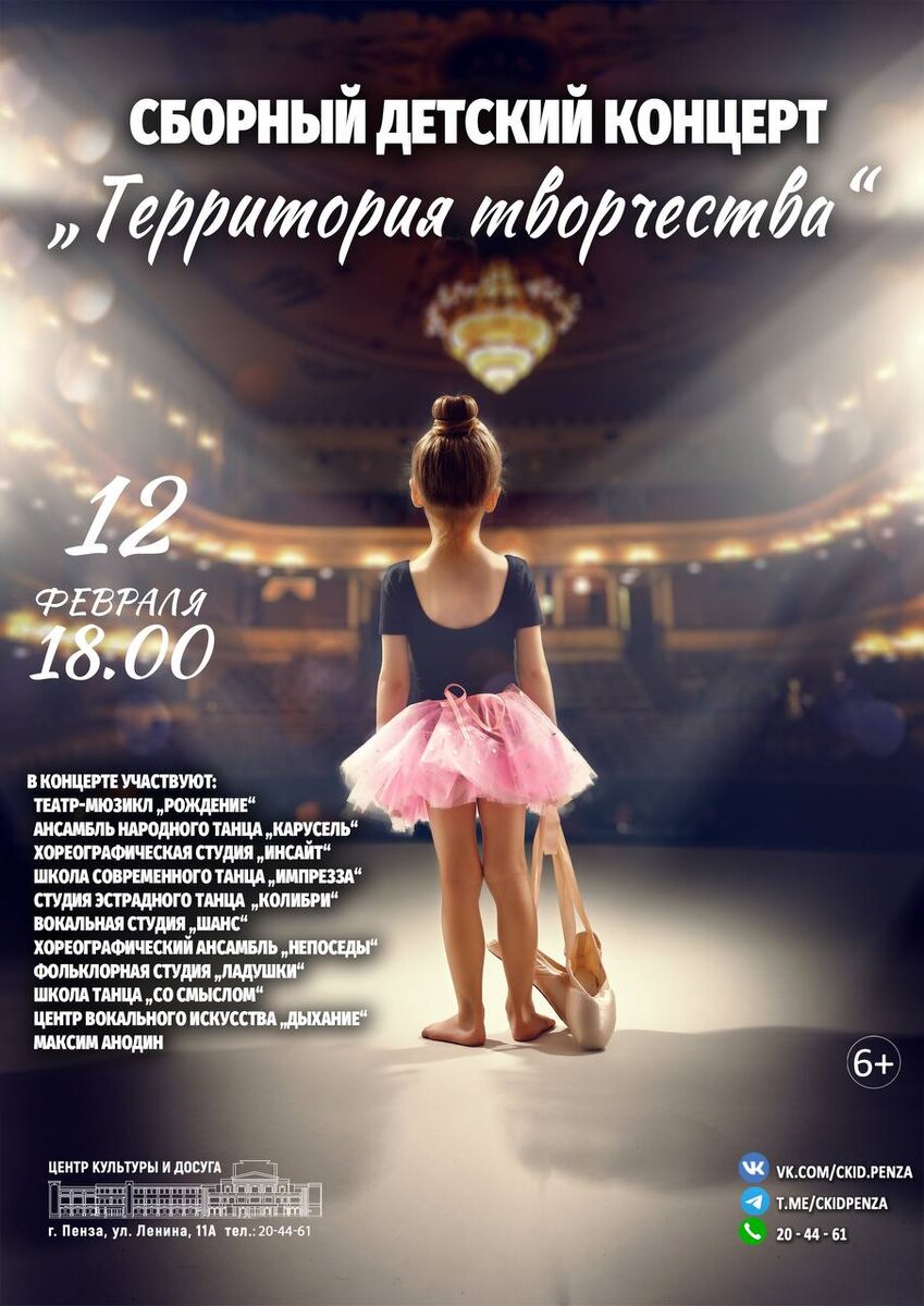 " ⭐ 🎉 Вас ждет невероятное шоу, в котором примут участие талантливые солисты, детские и юношеские хореографические и вокальные коллективы. 🎶Вы сможете насладиться яркими танцевальными номерами и вокалом, исполненными самобытным и зажигательным исполнением. 💥 В концерте выступят: - театр-мюзикл "Рождение" - хореографический ансамбль "Карусель" - хореографическая студия "Инсайт" - школа современного танца "Импрезза" - студия эстрадного танца "Колибри" - вокальная студия "Шанс" - хореографический ансамбль "Непоседы" - фольклорная студия "Ладушки" - школа танца "Со смыслом" - центр вокального искусства "Дыхание" - солист Максим Анодин 🌈 Приходите и окунитесь в мир детства, где каждый шаг наполнен волшебством и радостью! 6+ ❗Онлайн билеты: https://iframeab-pre7560.intickets.ru/seance/69702173/?bs_login
