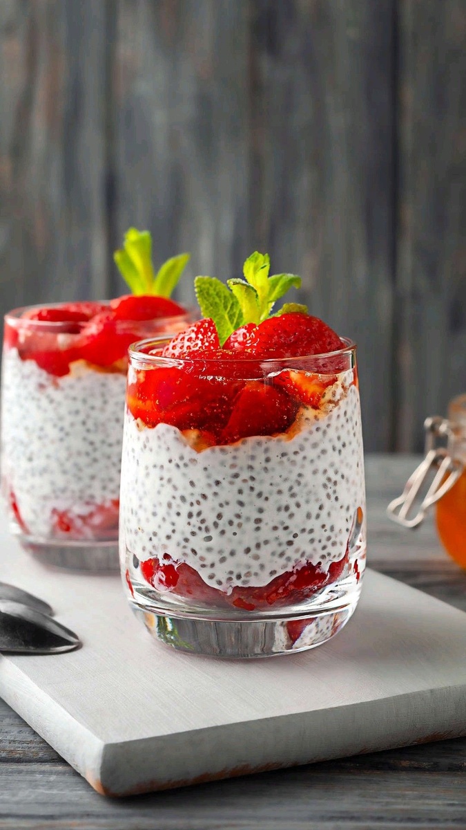 - Насыщенный вкус — клубника хорошо сочетается с семенами чиа, а мёд или сахарозаменитель добавляют нужную сладость.