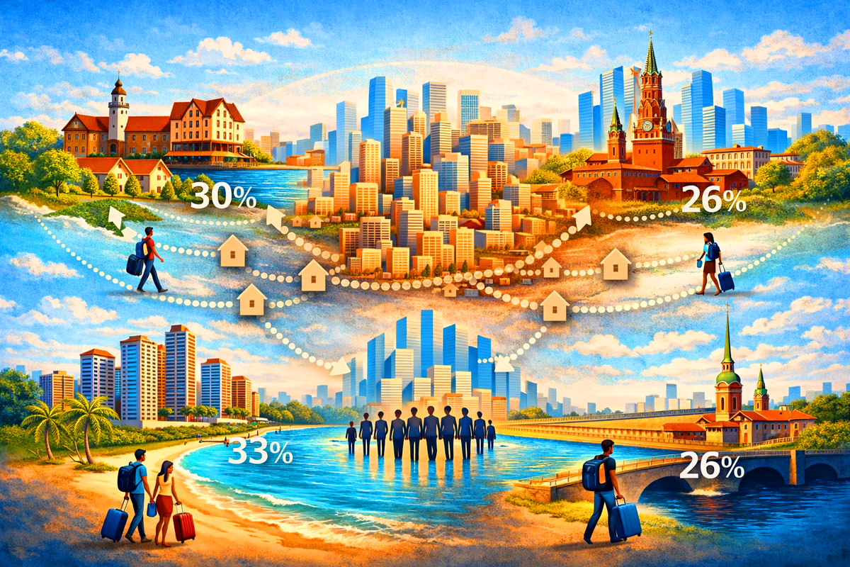 Межрегиональная миграция — это не просто переезд, это стратегическое голосование рублем за регионы с лучшим качеством жизни и экономическими перспективами. По данным аналитики за 2024–2025 годы, доля сделок по покупке недвижимости, совершенных покупателями из других субъектов, достигла 15% в общероссийском масштабе. Это критически важный показатель, демонстрирующий, что каждый шестой покупатель жилья — внешний.