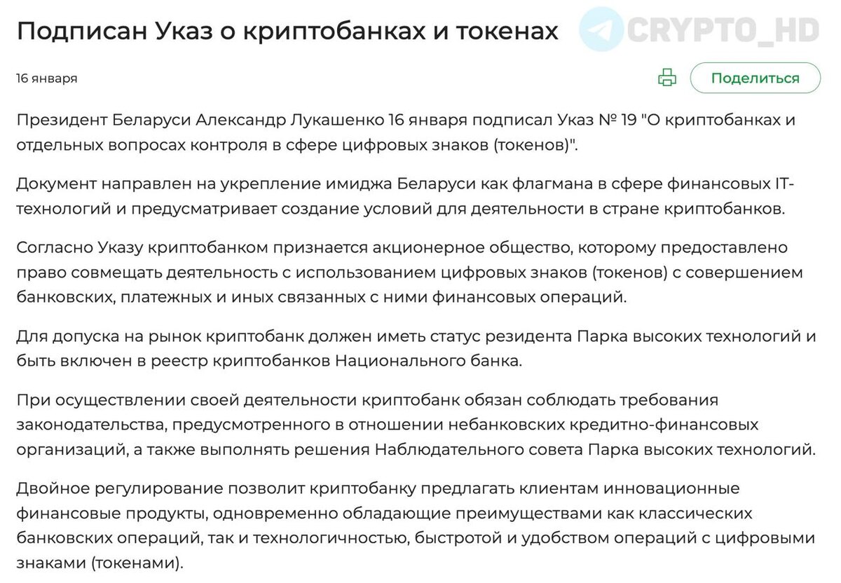 Александр Лукашенко подписал указ «о криптобанках и отдельных вопросах контроля в сфере цифровых знаков (токенов)» ➠ В стране появятся криптобанки – обычные компании, которые смогут одновременно работать с криптовалютой и предоставлять классические банковские услуги: переводы, вклады, кредиты. ➠ Стать криптобанком сможет не любая компания. Нужно быть резидентом Парка высоких технологий и попасть в специальный реестр Нацбанка. ➠ Криптобанки будут работать по правилам небанковских финансовых организаций и подчиняться решениям руководства ПВТ. ➠ Люди получат доступ к новым финансовым продуктам, которые сочетают надежность обычного банка со скоростью и удобством криптовалютных операций. ➠ Цель указа – укрепить позиции Беларуси как лидера в финансовых IT-технологиях и привлечь больше технологичного бизнеса в страну. Ранее: - криптовалюта вместо фиата - совещание - поручение для ЦБ Crypto Headlines
