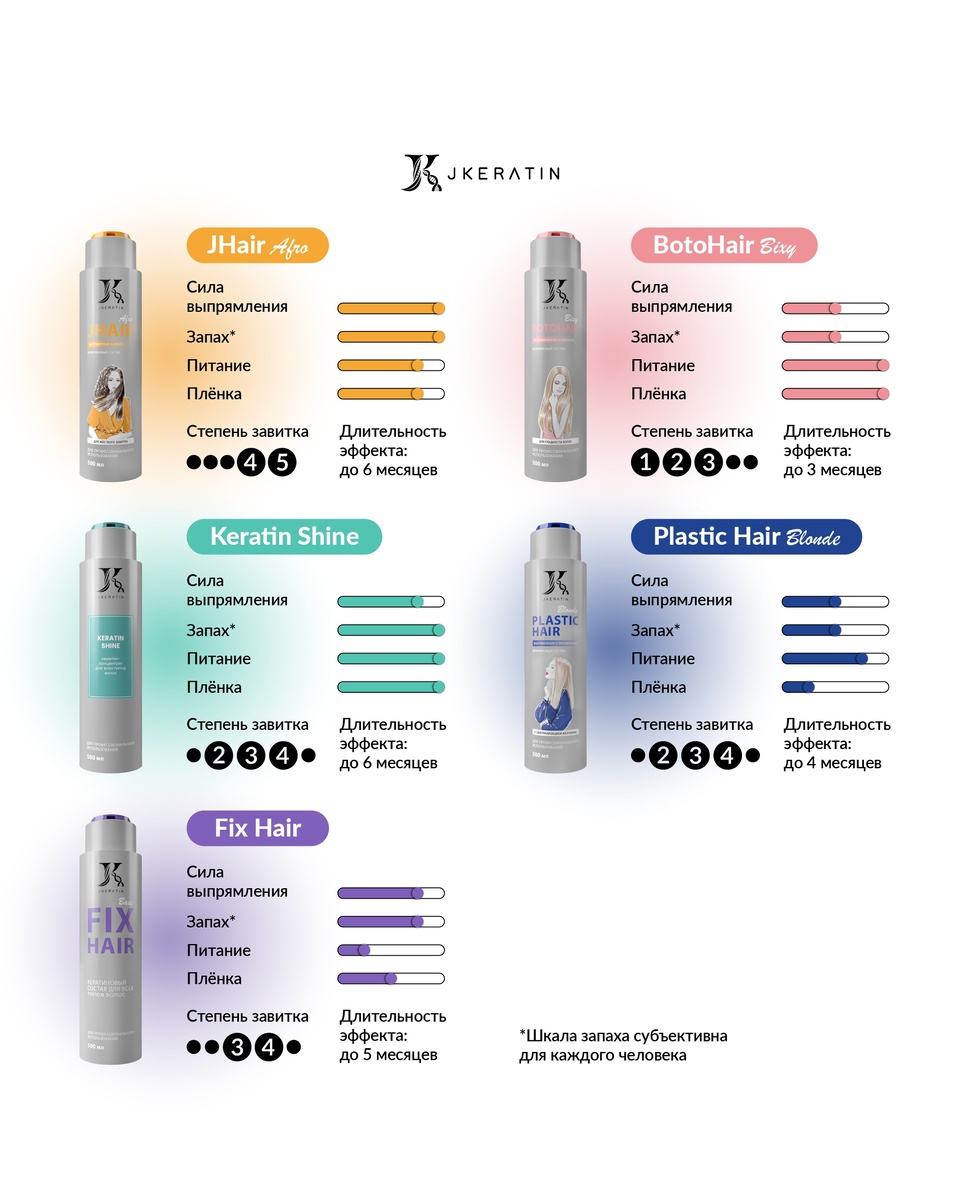 ✨Keratin Shine подходит для волос любого типа, кроме афрозавитка. Устраняет пористость, обладает высокой термозащитой и подходит даже для повреждённых волос. Придаёт волосам глянцевый блеск. 🧡JHair Afro предназначен для пористых, жёстких, кудрявых волос. Состав очень питательный, поэтому подходит для блонда. Придаёт волосам гладкость и блеск. ⚡Fix Hair подходит для всех типов волос. При работе с повреждёнными волосами рекомендуется регулировать свойства кератина с помощью активаторов. 💙Plastic Hair Blonde нейтрализует желтизну благодаря фиолетовому пигменту. Подходит не только блондинкам, но и любым пористым, окрашенным и осветлённым славянским волосам. Пигмент не виден на волосах другого оттенка. 🌸BotoHair Bixy подходит для волос с лёгкой пушистостью или незначительной волной. Он разглаживает волосы, позволяет сохранить прикорневой объём. Предназначен для процедуры «Ботокс волос» и подходит для повторной процедуры. #jkeratin