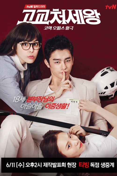 Сюжет Парню приходится вертеться словно ужу на раскаленной сковородке, пытаясь предстать в двух обличьях, а сложнее всего то, что он ничего не смыслит во взрослых правилах игры. Ему помогает коллега Чон Су Ён, причем не только в работе, но и в плане любовных отношений… Но здесь на пути возникает Чон Ю А – девушка-поклонница хоккейного бомбардира Ли Мин Сока.Юмористический сериал «Король старшей школы» можно назвать комедией положений. В центре внимание фильма находятся двое братьев: Старший Ли Хён Сок и младший Ли Мин Сок, родившийся на девять лет позже.Удивительно, но эти годы незаметны, когда смотришь на них обоих – они практически одно лицо! Кроме этого, младший Ли – ученик старшей школы "Пунчжин" и нападающий хоккейной команды, а старший брат возглавляет одно крупное предприятие. И именно старший вдруг ни с того ни с сего просит своего брата Мин Сока выполнить одно неординарное поручение – воспользовавшись схожестью, на время заменить Хён Сока в кресле исполнительного директора, та