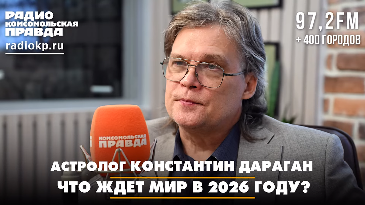 Астролог Константин Дараган дал интервью "Комсомольской правде". Спасибо за донаты. Продолжаем. Это интервью есть в текстовом варианте, поэтому все слово в слово публиковать не будем, можете сами прочитать его здесь https://radiokp.ru/podcast/dialogi-na-radio-kp/775096?ysclid=mkgi37oneo933775625. Выделим основные предсказания. Можете посмотреть это в виде видео, Радио Комсомольская правда, называется "Астролог Константин Дараган: Что ждет мир в 2026 году"