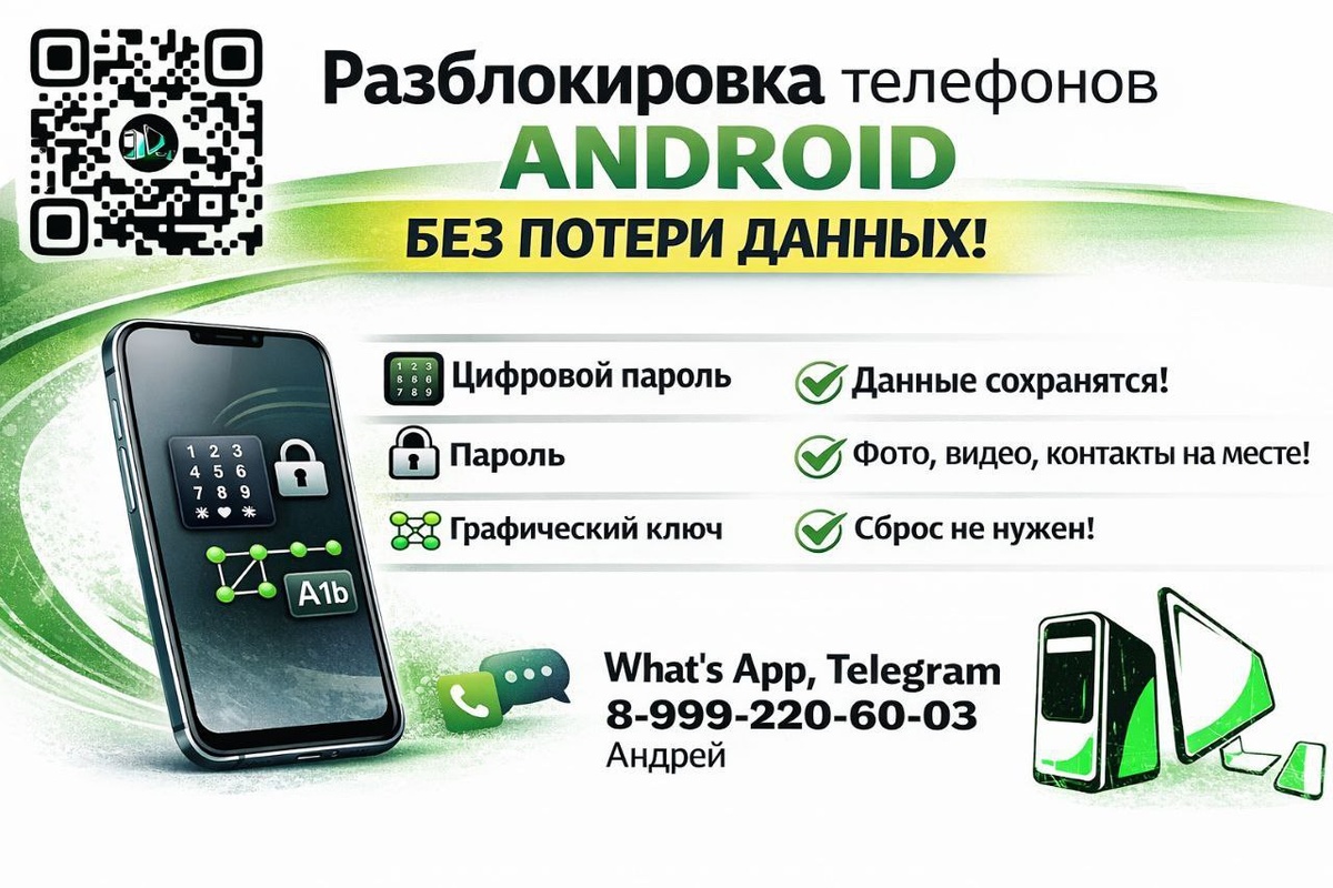 Снятие блокировки экрана без сброса и удаления информации (фото, видео, контакты, мессенджеры остаются на месте). 📱 Поддерживаемые типы блокировок: 🔢 цифровой PIN-код 🔒 пароль 🧩 графический ключ 🔐 цифро-буквенный пароль ⚠️ Важно: не все модели и версии Android поддерживаются; возможность разблокировки определяется после проверки устройства; в некоторых случаях может быть предложён альтернативный вариант. 📍 Работа при личной встрече, все проверки по факту. ⚡ На связи круглосуточно, только реальные обращения. Телеграмм @andrey_remont_fixies #Реклама