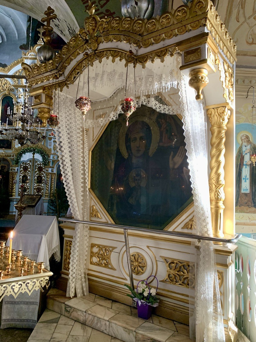 С иконы еще не была снята серебряная с драгоценными камнями риза – подарок прихожан. Краски на иконе действительно и поблекли, и треснули, и частично отвалились. В начале 1950 гг. Образ Богородицы был переписан, скорее всего на тех же самых кедровых досках, на которых написал икону Знамения Спиридон Иконников. При определенном освещении в соборе можно увидеть неровности старых красок, поверх которых сделано новое изображение. Конечно, только тщательный анализ мог бы сделать окончательное заключение.