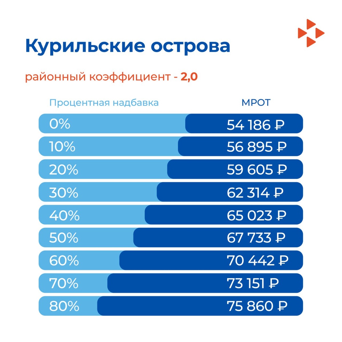 Размер минимальной зарплаты зависит от района, где вы работаете, и от процентной надбавки за стаж. ▶️Курильские острова — районный коэффициент 2,0 ▶️Охинский и Ногликский муниципальные округа — 1,8 ▶️Южные и центральные районы Сахалина — 1,6 На карточках видно, как меняется сумма МРОТ при разной процентной надбавке — от 0 до 80%. ❗️Обратите внимание: эти суммы действуют для всех работников Сахалинской области, кроме сотрудников организаций, которые финансируются из федерального бюджета. Если остались вопросы по зарплате, надбавкам или условиям работы — в агентстве по труду и занятости региона всегда подскажут и помогут разобраться. ☎️8 (4242) 67-25-64. 😍 Подпишись на Кадровый центр: MAX | ТГ