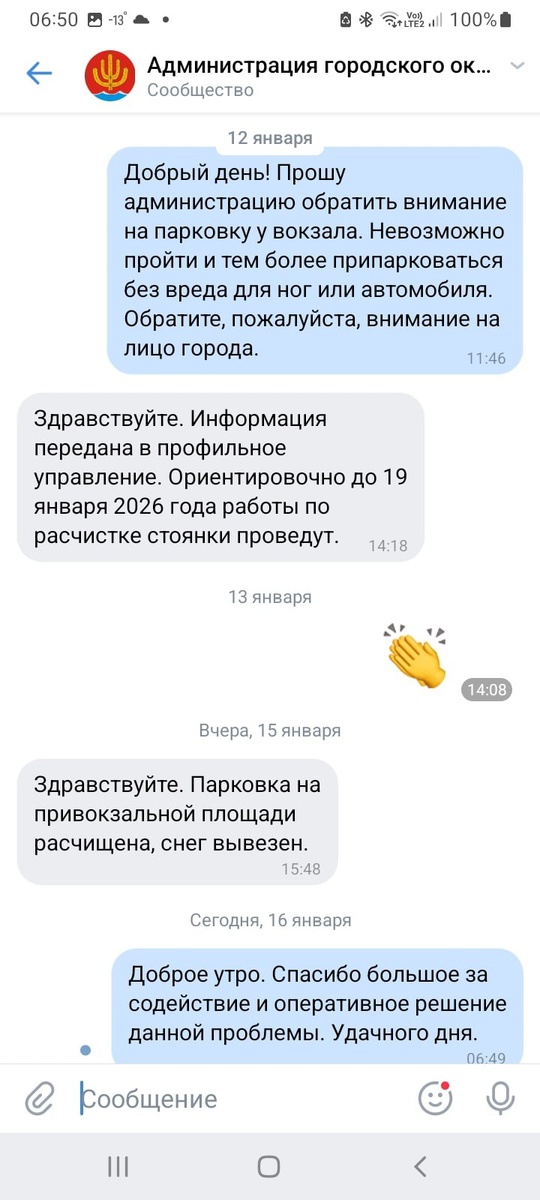 Написала в администрацию о том, что на привокзальной площади после снегопадов ни проехать ни пройти. Выражаю им благодарность за скорое решение данной проблемы . Спасибо. Хорошо бы , конечно, чтобы те, кто это должен делать не дожидались жалоб и просьб граждан, а сами исполняли свои обязанности. Третий год пишу и третий год чистят сразу после обращения. Правда пишу, когда уже действительно не проехать, не пройти. Тем не менее спасибо администрации за оперативность. 👤 Евгения Лонская Шарья – столица мира Крупнейшее городское СМИ Источник: Открыть