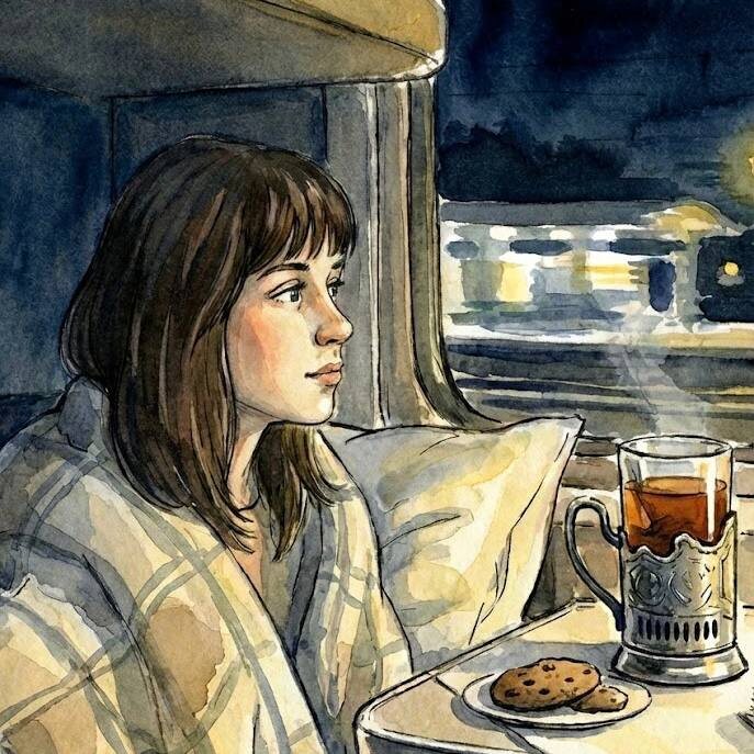 Перед сном я прошу Алису включить звук поезда. Я укутываюсь в одеяло так, что наружу торчит только нос. И почти сразу проваливаюсь в какое-то очень правильное, безопасное место для своей психики. Вот уж не думала, что моё персональное убежище окажется таким… железнодорожным. Я сразу оказываюсь где-то в вечернем поезде. Нижняя полка в купе. Все уже спят — это важно, мир должен спать, чтобы не задавать вопросов. А ты тихонько пьёшь горячий чай в фирменном подстаканнике. Тот самый, тяжёлый, с гербом и следами чужих жизней. Жуёшь печеньку, которая стоила преступно дорого и в обычный день была бы отвергнута с моральным превосходством. Но здесь без неё нельзя. Здесь она — часть ритуала. Как благовоние в храме. Тусклый свет ночника. Ты пытаешься читать. Обязательно бумажную книгу. Телефон в этот мир не допускается — у него слишком много эго. Слышно: чух-чух, чух-чух. Не звук — мантра. Мысли, как плохие пассажиры без билета, постепенно сходят на ближайшей станции. Остаётся только ритм. То