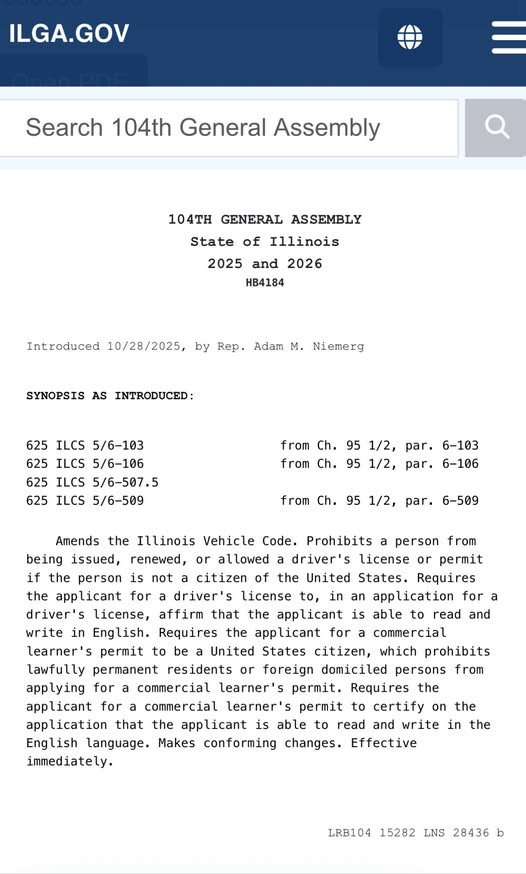 Только что увидел это на ютубе. Сначала ушам своим не поверил, но перепроверив, всё оказалось правдой. Кто-бы мог подумать, такой хардкорный законопроект, и не из какой-то Оклахомы вам, а из Иллинойса! Из рассадника нон-домисайлоф. Вау…слабо конечно верится, что при нынешних политических раскладах в этом синем-при-синем штате этот законопроект имеет хотя бы малейший шанс реализоваться, но сам факт того, что здесь нашлись политики с «яйцами» наверное удивит многих. Как обычно, текст переведен для вас единственным и неповторимым Google Translate. - - - - - - - - - Вносятся поправки в Кодекс штата Иллинойс о транспортных средствах. Запрещается выдача, продление или предоставление водительских прав или разрешений лицам, не являющимся гражданами Соединенных Штатов. Заявитель на получение водительских прав обязан в заявлении подтвердить свою способность читать и писать на английском языке. Заявитель на получение разрешения на управление коммерческим транспортным средством должен быть гр
