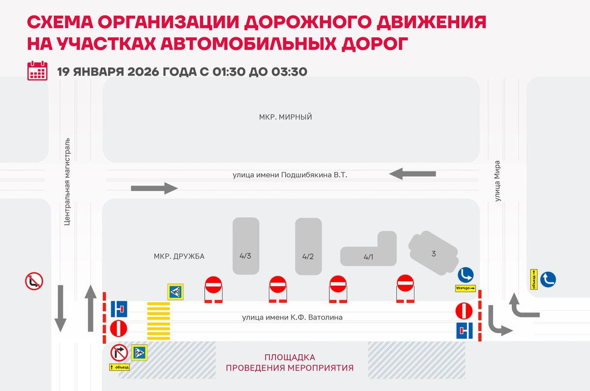 Временное перекрытие дороги! 19 января в период с 01:30 до 03:30 в связи с крестным ходом будет закрыт участок дороги по улице имени К.Ф. Ватолина (от пересечения с улицей Мира до перекрестка с Центральной магистралью). Объехать закрытый участок можно будет по улицам 70-летия Октября, Мира, имени В.Т. Подшибякина. Подробнее — в нашей карточке 👆🏻 ❤️ НУР. Официально | Подписаться в MAX