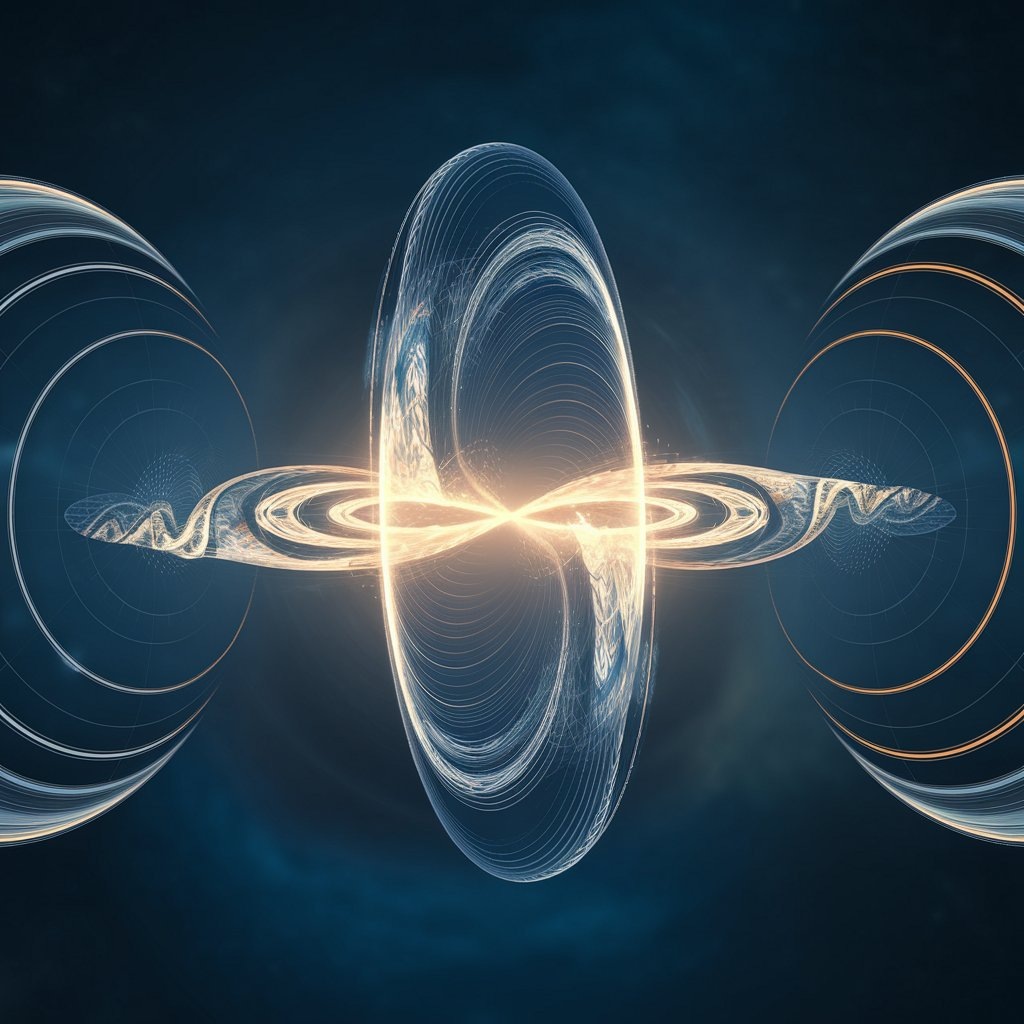 Style: Hyperdetailed, volumetric light, fractal recursion, ethereal glow, mathematical elegance, dark cosmic background. V-ray, octane render, 8K. Aspect: God’s-eye view showing full symmetric dual-infinity path.