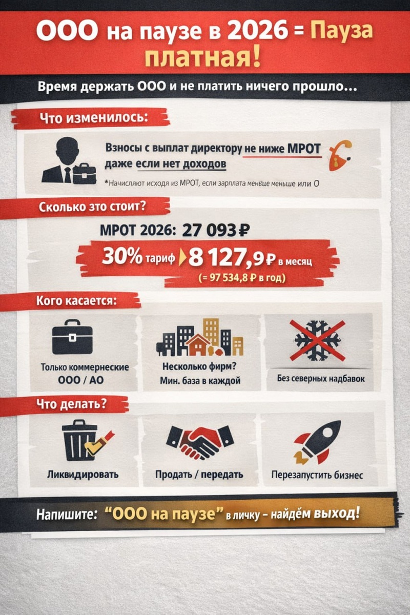 Вот почему. 🔥С 1 января 2026 государство официально говорит: «хочешь держать ООО — держи, но бесплатно уже не будет». Что поменялось❓ В НК добавили правило для единоличного исполнительного органа (ЕИО) — то есть директора/гендира коммерческой компании: если за месяц директору начислили выплат меньше федерального МРОТ (или вообще 0), то база по страховым взносам для расчёта всё равно считается равной МРОТ. 🔥🔥🔥ФНС отдельно подчеркнула: это не зависит от того, ведёт ли компания деятельность, есть ли выручка, есть ли трудовой договор, сколько директор “фактически работал”, и т.д. Позиция оформлена письмом ФНС от 22.12.2025 № БС-4-11/11507@. Сколько это в деньгах❓ МРОТ в 2026 — 27 093 ₽. Если у вас общий тариф 30%, то минимум взносов за директора: 27 093 × 30% = 8 127,90 ₽ в месяц (≈ 97 534,80 ₽ в год). Да, даже если “ООО не работает и денег нет”. Теперь это не аргумент — это просто грустная история. Кого касается❓ 🎯Только коммерческие организации (ООО/АО и т.п.). Если директ