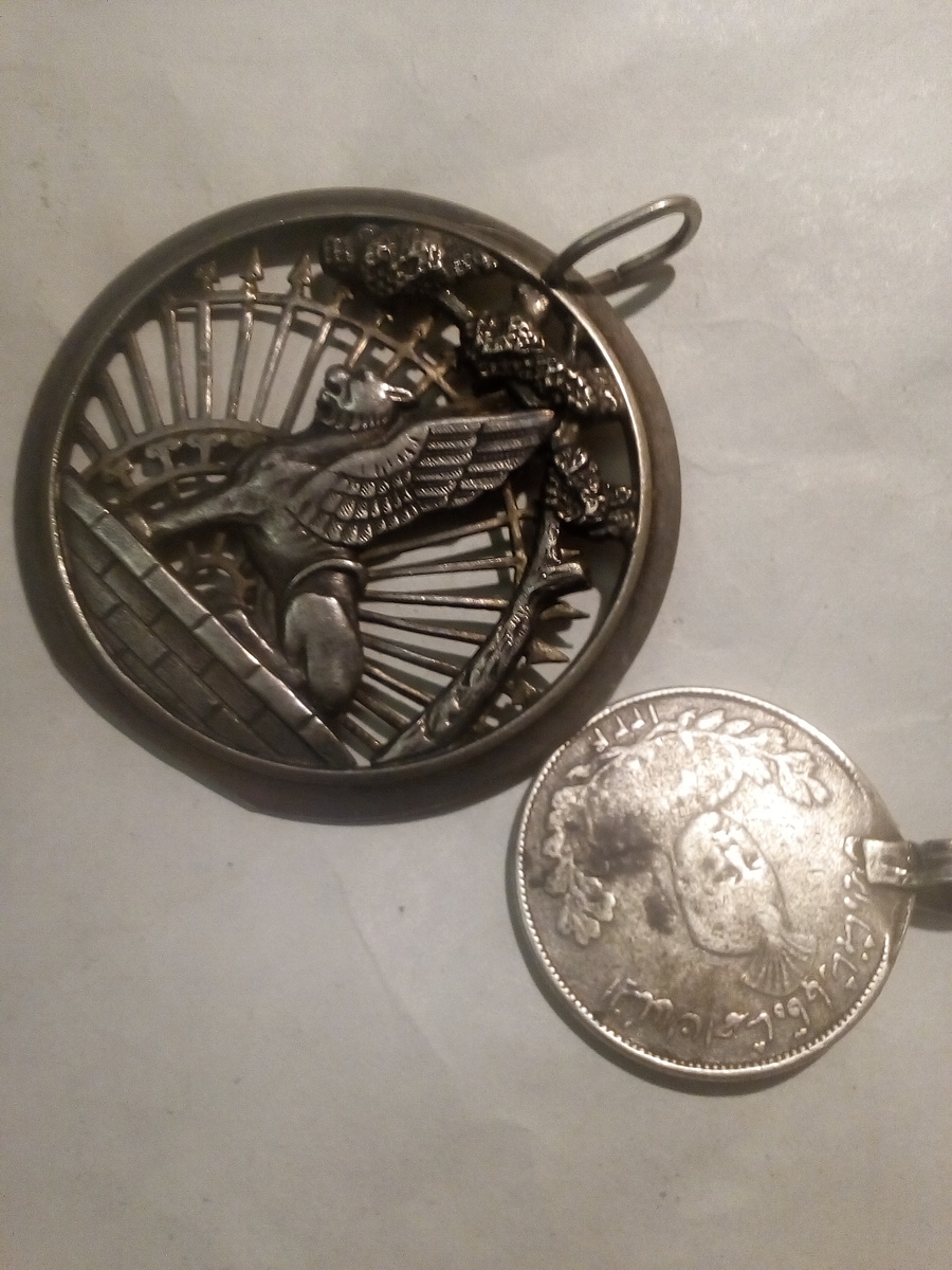 Такого, наверно, ни у кого нет, кроме меня. Испортили брошь, сделали подвеску... Вспоминается незабвенное: "У нас в деревне тоже были хипаны..." Иранский кулон - для понимания габарита... А вот подвеска с ним рядом - из довоенного полтинника.... Тигр, как я думаю - из Китая. Одна подвеска - современны Китай, а с утерянными вставками - из Германии... Старинная подвеска, да. Погремушка. На ошейник любимой болонки? Медаль 1896 года. Тем кто служил до 1855. Редкая: бронза в посеребрении. Таких не выпускали. Либо серебряные (20 000 экз) были, либо бронзовые (200 000 экз). :0))) А это.... - В стиле "БОХА". - Каком стиле? - Боха.... - Что это за стиль?! - Ну, это от слова "бохато"....