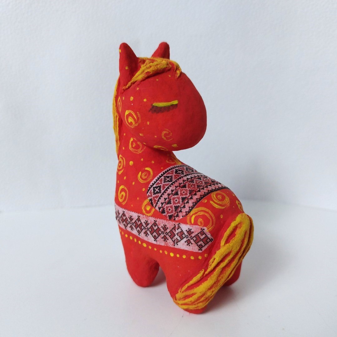 Огненная, ярко-красная лошадка, имитирована под керамику, покрыта двойным слоем глянцевого лака. Вот такая красочная лошадка у меня получилась.