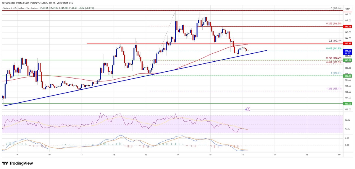 Солана скорректировала свои достижения, не удержавшись выше отметки в $146. Сейчас цена SOL торгуется ниже $145, и есть вероятность найти поддержку около зоны $140. 📊 Ключевые моменты: - SOL торгуется ниже $145 и 100-часовой простой скользящей средней. - Бычья линия тренда формируется с поддержкой на уровне $141. - Основные уровни сопротивления: $144, $146, $148. Прорыв выше $148 может привести к росту до $155 и $162. - Основные уровни поддержки: $141, $140. Прорыв ниже $140 может привести к снижению до $132 и $124. - Часовой MACD находится в медвежьей зоне. - Часовой RSI ниже 50. ⚠️ Риски: Возможно дальнейшее снижение, если SOL пробьет поддержку $140. Горизонт: Краткосрочно